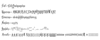 เหมาะสำหรับการสร้างโลโก้ที่ดึงดูดใจ ปกหนังสือที่ลึกลับ และโปสเตอร์งานอีเวนต์ที่โดดเด่น Lutin Paniquangoisse กระตุ้นความคิดสร้างสรรค์ด้วยความรู้สึกที่วาดด้วยมือและการตกแต่งที่ประณีต เซอริฟที่คมและปลายที่ม้วนเพิ่มบุคลิกภาพและการเคลื่อนไหวให้กับตัวอักษรแต่ละตัว ทำให้เป็นตัวเลือกที่ยอดเยี่ยมสำหรับบรรจุภัณฑ์หรือคำเชิญที่ต้องการสื่อถึงเสน่ห์ของหนังสือนิทาน ครอบครัวตัวอักษรนี้เป็นทรัพย์สินที่หลากหลายสำหรับโครงการใด ๆ ที่ต้องการกระตุ้นอารมณ์และเวทมนตร์